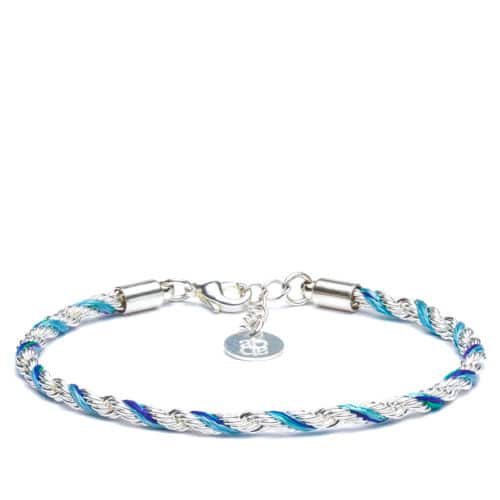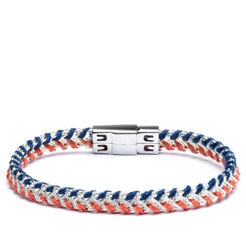 Ce bracelet est entièrement fait à la main dans des ateliers parisiens par des artisans spécialisés. C’est une chaîne en laiton argentée brodée de fils de coton DMC.