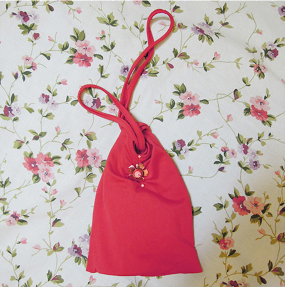 Je suis une sorte d’Emmaüs, et mes amies pensent toujours à moi avant de liquider leurs fringues. Pas plus tard que la semaine dernière, ma copine Sophie débarque chez moi avec une pile de vêtements dont elle ne se servaient plus. J’avais besoin de matière pour faire une pochette, et comme je voulais que celle-ci porte un peu du vêtement précédent, j’ai choisi ce débardeur rouge qui ne payait pas de mine en me disant que le décolleté en V et les petites fronces, faisaient très « débardeur », et que je m’éviterais une grosse demi-heure de travail en me servant des bretelles comme de hanses.