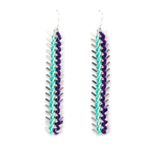 The loops and chains are silver plated brass. The thickness of the sterling silver plating is 10 microns. The embroidery has been done with glass beads, cotton threads for the most part, and lurex thread for the orange shiny one.