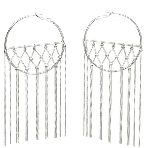 These earrings are handmade by skilled artisans in parisian workshops. It is composed of two silver plated brass loops and silvered chain, embroidered with glass beads, cotton and lurex threads.
