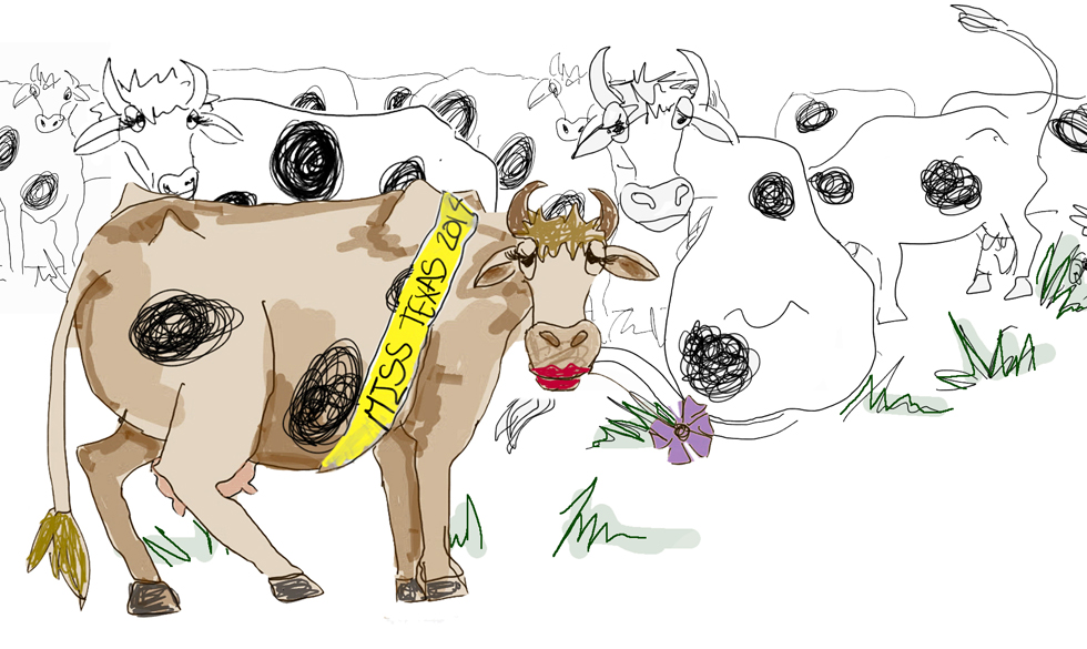 Je devais illustrer des phrases avec humour, l’image du haut est l’illustration de la phrase suivante : « in Texas, the best cows make the best leather »