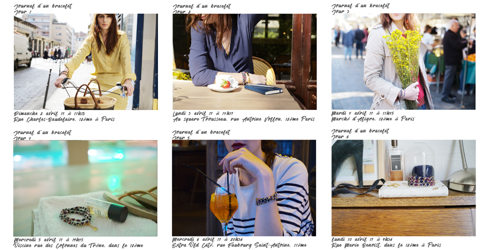 Les ventes du bijou du mois d’avril se terminent demain. En attendant, je vous poste les 6 photos que j’ai prises pour annoncer le lancement de ce bijou. J’ai retracé la semaine d’une parisienne à travers ce bijou, puis j’ai pisté les photos jour après jour sur les réseaux sociaux. Je trouvais drôle l’idée du petit bracelet qui se ballade au poignet de sa propriétaire et qui écrit son journal de bord. En tous cas, on s’est bien amusé à prendre les photos.