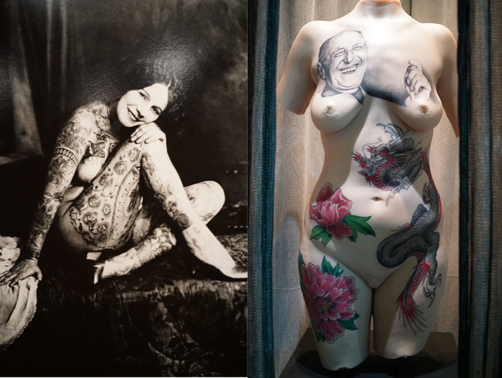 Image de droite : corps en cire tatoué par Tintin, grand tatoueur admiré par son style hyperréaliste