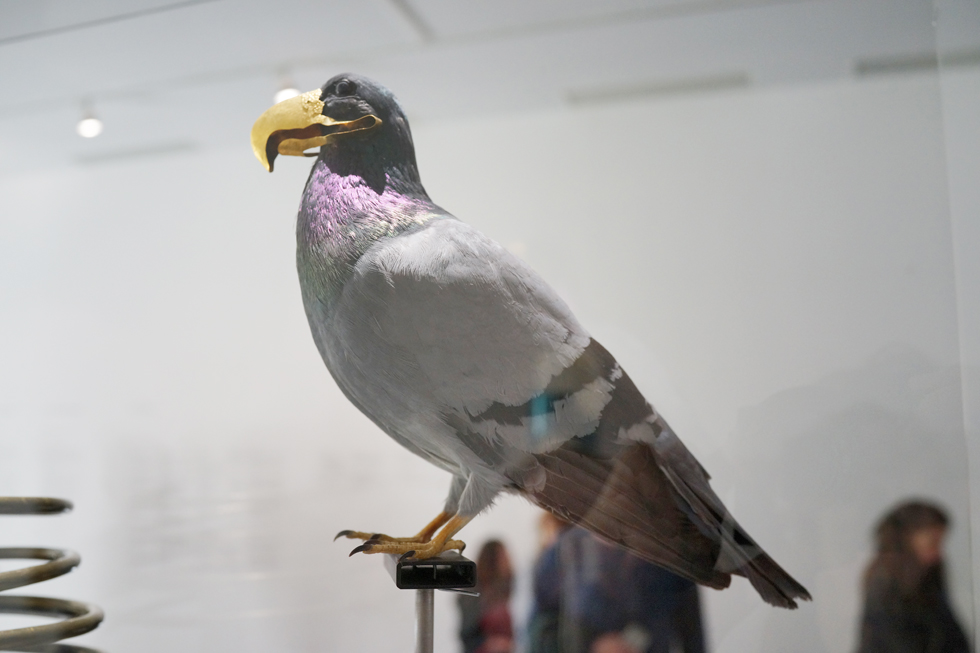 Ce pigeon (empaillé probablement) a un bec toucan. Et bien, c’est justement là qu’est intervenu l’artiste, il lui a rajouté cette extension de bec doré, qui lui donne un petit air exotique.