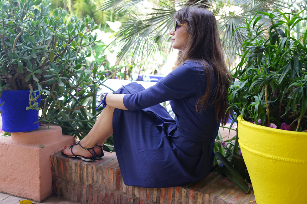 Mais ce poste aura quand même sa touche de mode. Pour ceux qui en auront marre de voir des cactus et des pots de fleurs, je vous ai mis une robe bleue dont la teinte s’accorde un peu trop bien avec celle du jardin. Et good news, pour une fois, je ne porte pas un truc fabriqué dans les années 20, et donc introuvable. Cette robe fait partie des robes issue de la collaboration Ines de la Fressange pour Uniqlo et est disponible sur le site d’Uniqlo. Alors non ce n’est pas vraiment Berbère, mais c’est pas mal non plus. Les chaussures sont des sandales Azzaro qui m’avaient été données pour la sainte Catherine.