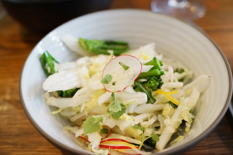 Et voici le fromage ! Un comté délicieux coupé en lamelles fines saupoudrées de citron confit et de gomasio. Un des trucs les meilleurs, a choisir absolument.