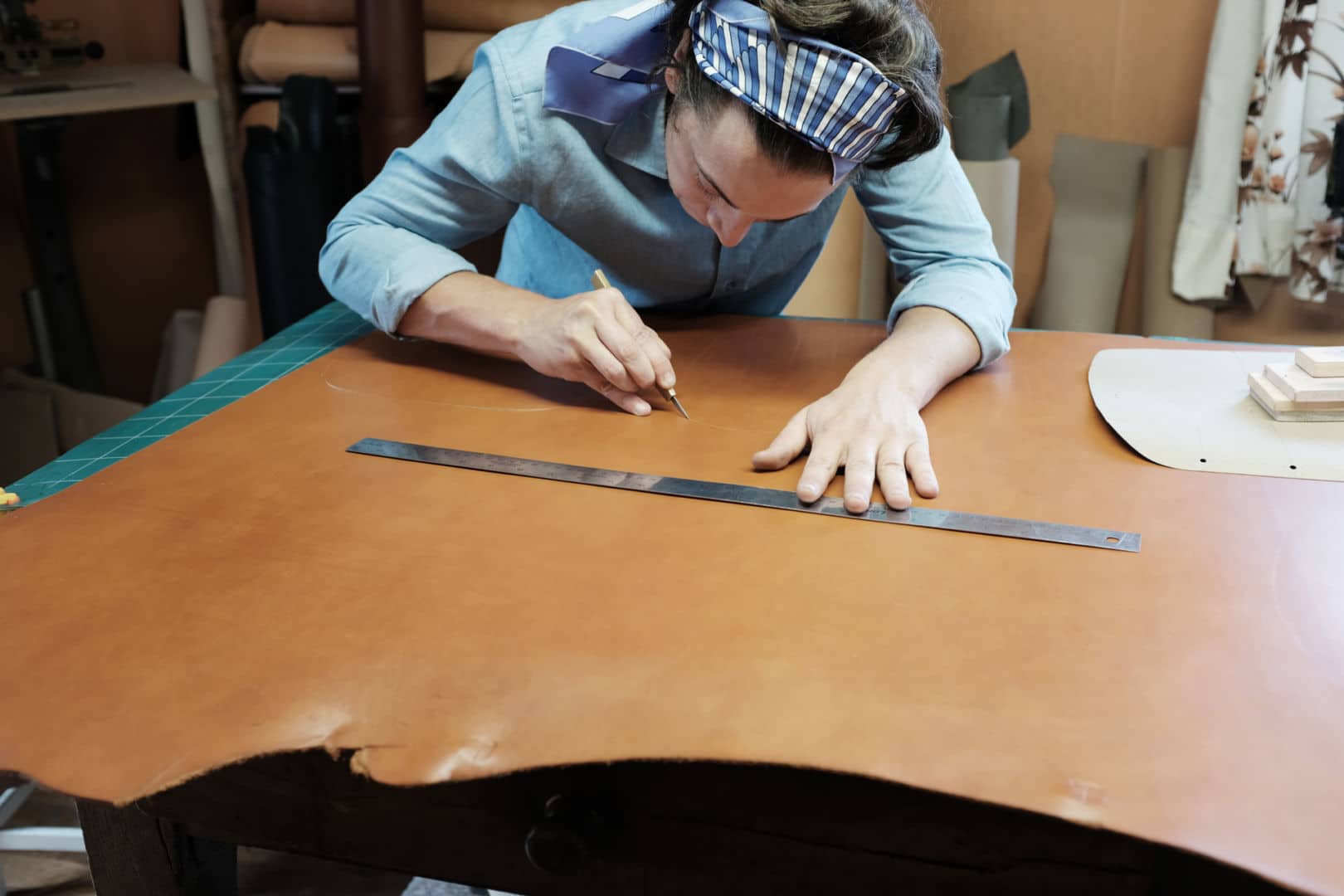 L’autre particularité des sacs Anthenay est la finition des tranches. Au lieu d’appliquer une peinture plastique qui a tendance à craquer comme cela se fait habituellement, Tibère utilise un outil spécial (l’abatcare) qui permet un résultat plus durable sans avoir recours à l’utilisation de produits chimiques.